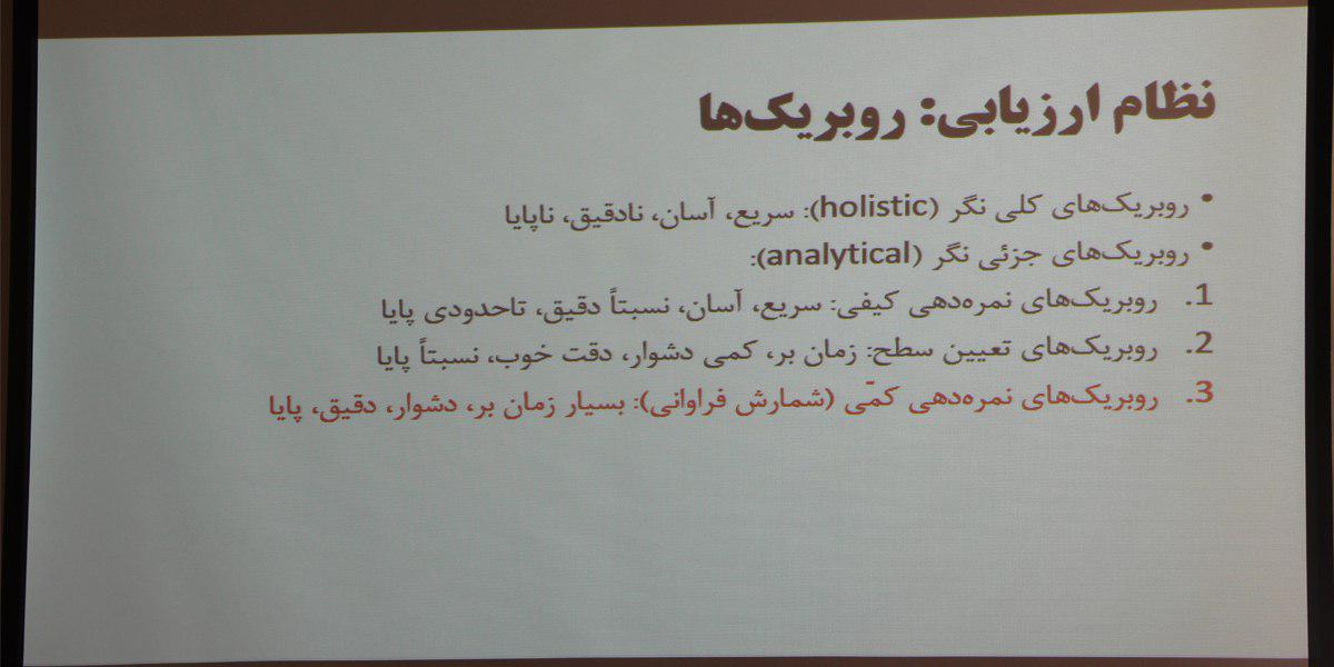 وی خاطر نشان کرد که در فرایند تعیین سطح آزمون های مهارتی در این دورۀ دانش افزایی، نظام نمرهدهی کمّی مدّ نظر نیست، بلکه تعیین سطح مهارت های نگارش و صحبت کردن زبانآموزان براساس روبریکهای تعیین سطح و با توجه به مؤلفههای هر مهارت انجام میگیرد. در این راستا برگزاری دورههای هم ذهن سازی (calibration) برای دستیابی به نتایج عادلانه و پایا ضروری است.