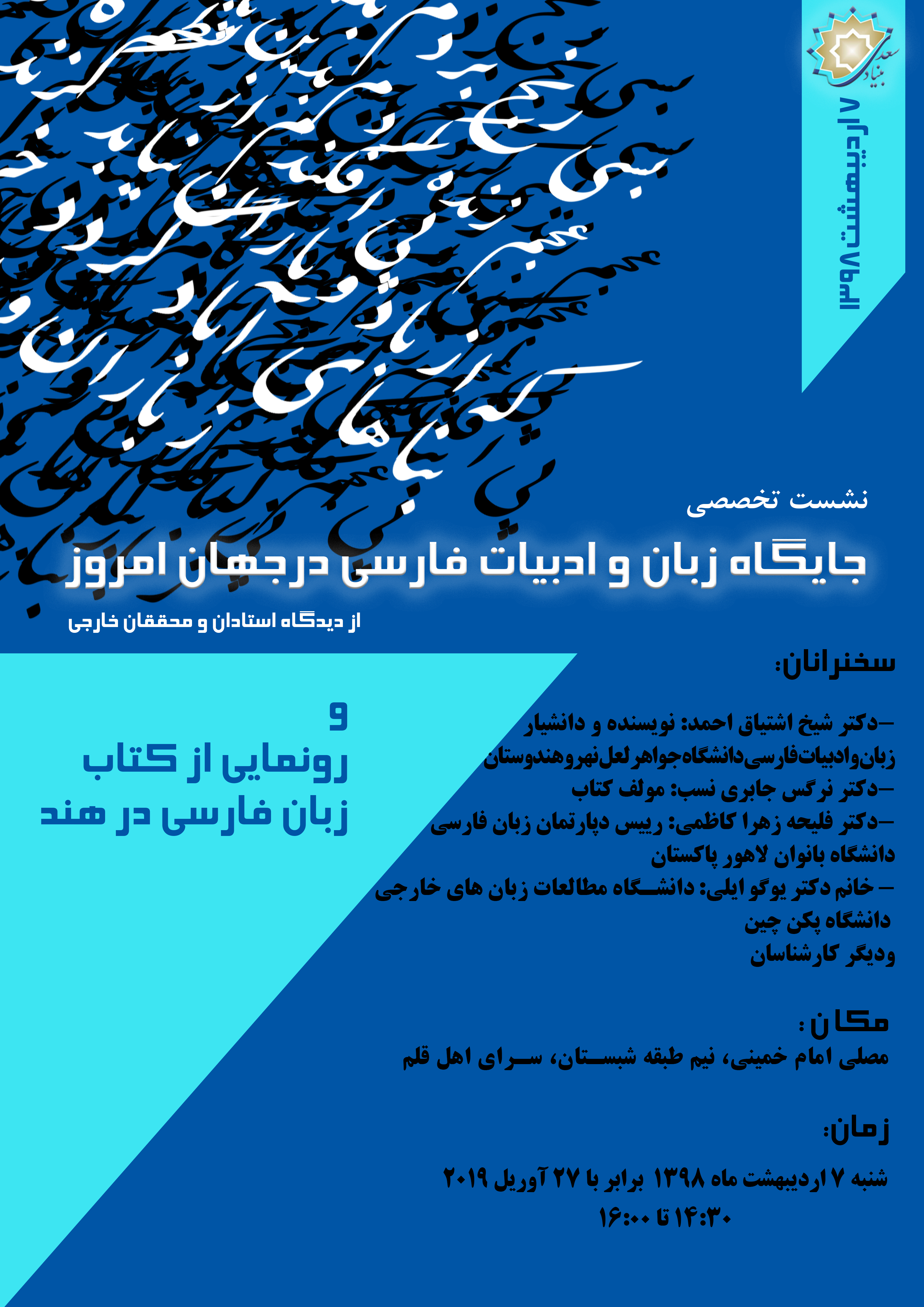 نشست تخصصی دوم نیز با موضوع «جایگاه زبان و ادبیات فارسی از نگاه محققان و استادان خارجی» با حضور استادانی از کشورهای هند، چین، پاکستان برگزار خواهد شد و رونمایی از کتاب « زبان فارسی در هند» انجام می شود. این نشست از ساعت 14:30تا 16:00 در مصلی امام خمینی(ره)، نیم طبقه شبستان، سرای اهل قلم برگزار خواهد شد.