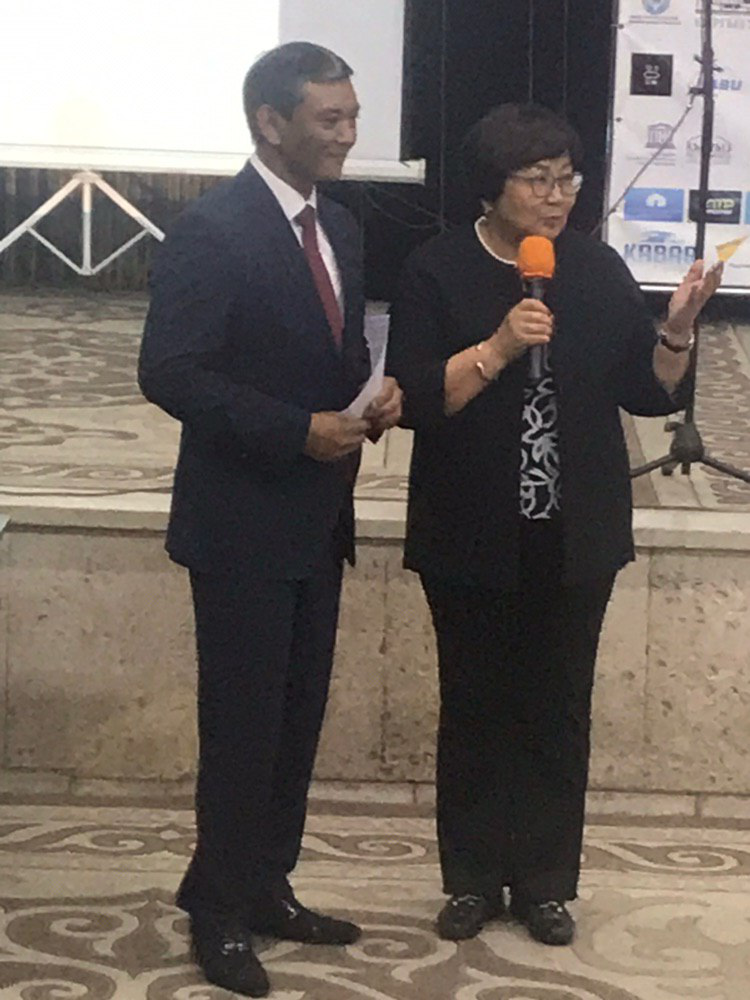 در ادامه نوبت به اجرای برنامه از سوی نماینده ایرانی حاضر در مراسم رسید. اوکسی نبود جز فاطمه محمدی دانش آموز مدرسه امام خمینی ( مدرسه ایرانیان بیشکک) که علاوه بر زبان فارسی به زبان های روسی و قرقیزی نیز تسلط دارد و اجرایش یک روز قبل از این برنامه یعنی در برنامه روز ایران نمایشگاه راه ابریشم بشدت مورد استقبال رزا آتونبایوا رئیس جمهور سابق قرقیزستان قرار گرفته بود.  دانش آموز ایرانی قصه رستم و سهراب شاهنامه را به خوبی  به زبان فارسی اجرا کرد و در این حین بود که رزا آتونبایوا از آقای قاسمی رایزن فرهنگی خواست که ترجمه روسی این بخش از شاهنامه نیز در صورت امکان خوانده شود لذا خانم محمدی  همان بخش از شاهنامه را که به فارسی خوانده بود به زیبایی و با تسلط کامل به زبان روسی نیز برای حاضران در مراسم خواند.  پس از آن بود که  بایاس تورال مترجم قرقیزی شاهنامه نیز که همزمان در جایگاه قرار گرفته بود؛ قسمتی از شاهنامه را به زبان قرقیزی خواند.
