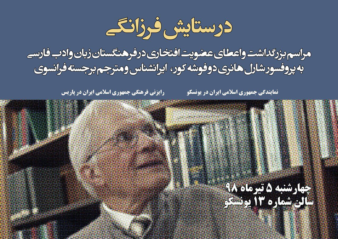 به همت نمایندگی جمهوری اسلامی ایران در یونسکو و رایزنی فرهنگی ایران در فرانسه ،آیین بزرگداشت و "اعطای عضویت افتخاری فرهنگستان زبان و ادب فارسی به پروفسور شارل هانری دوفوشه کور" ایران‌شناس و مترجم فرانسوی، برگزار شد