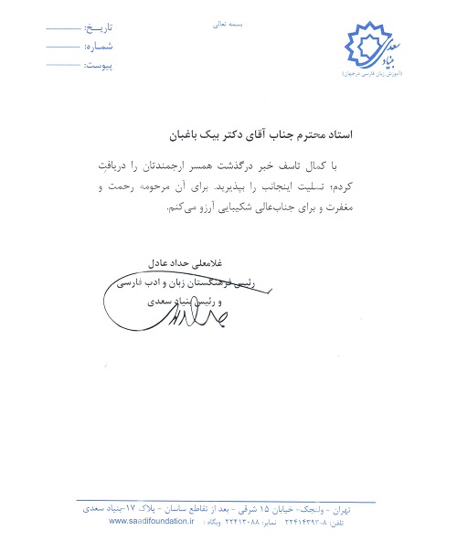 متن پیام رییس فرهنگستان زبان و ادب فارسی و رییس بنیاد سعدی برای دکتر بیک باغبان به شرح زیر است: