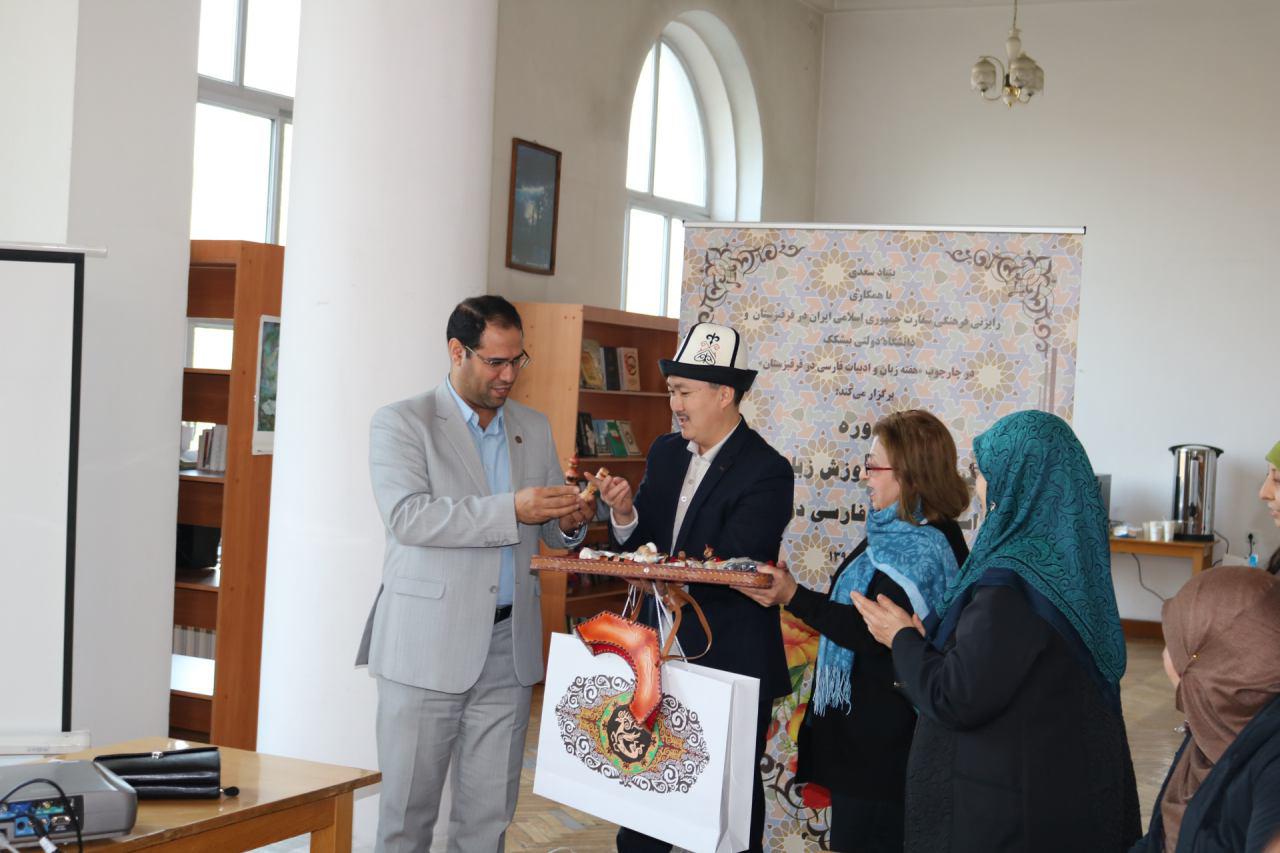نولان بالتابایف از استادان برجسته زبان فارسی درقرقیزستان نیز به نمایندگی از دانشگاه دولتی بیشکک از بنیاد سعدی و شخص دکتر مرادصحرایی بخاطر برگزاری موفقیت امیز و ثمربخش این دوره و از رایزنی فرهنگی کشورمان برای اهتمام دربرگزاری هفته زبان و ادبیات فارسی در قرقیزستان تقدیر وتشکربعمل اورد.