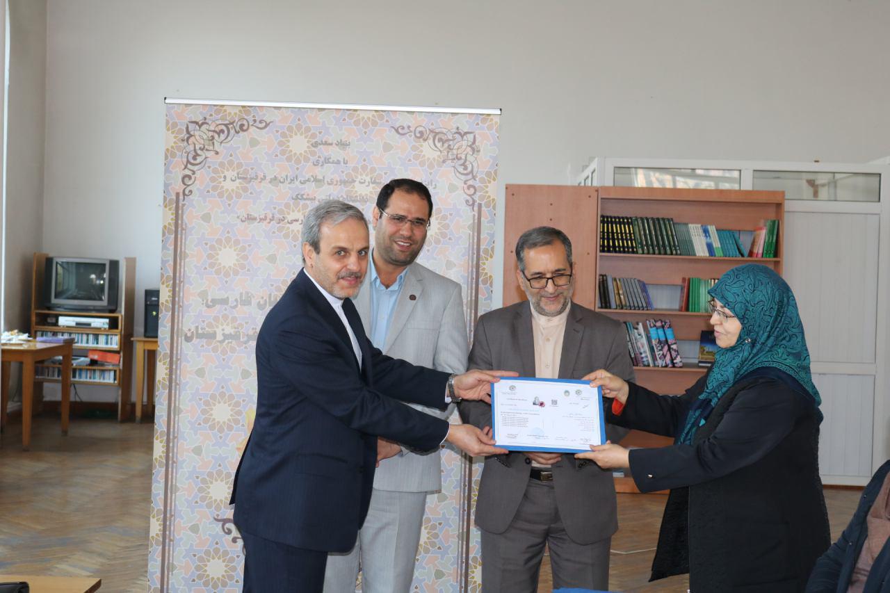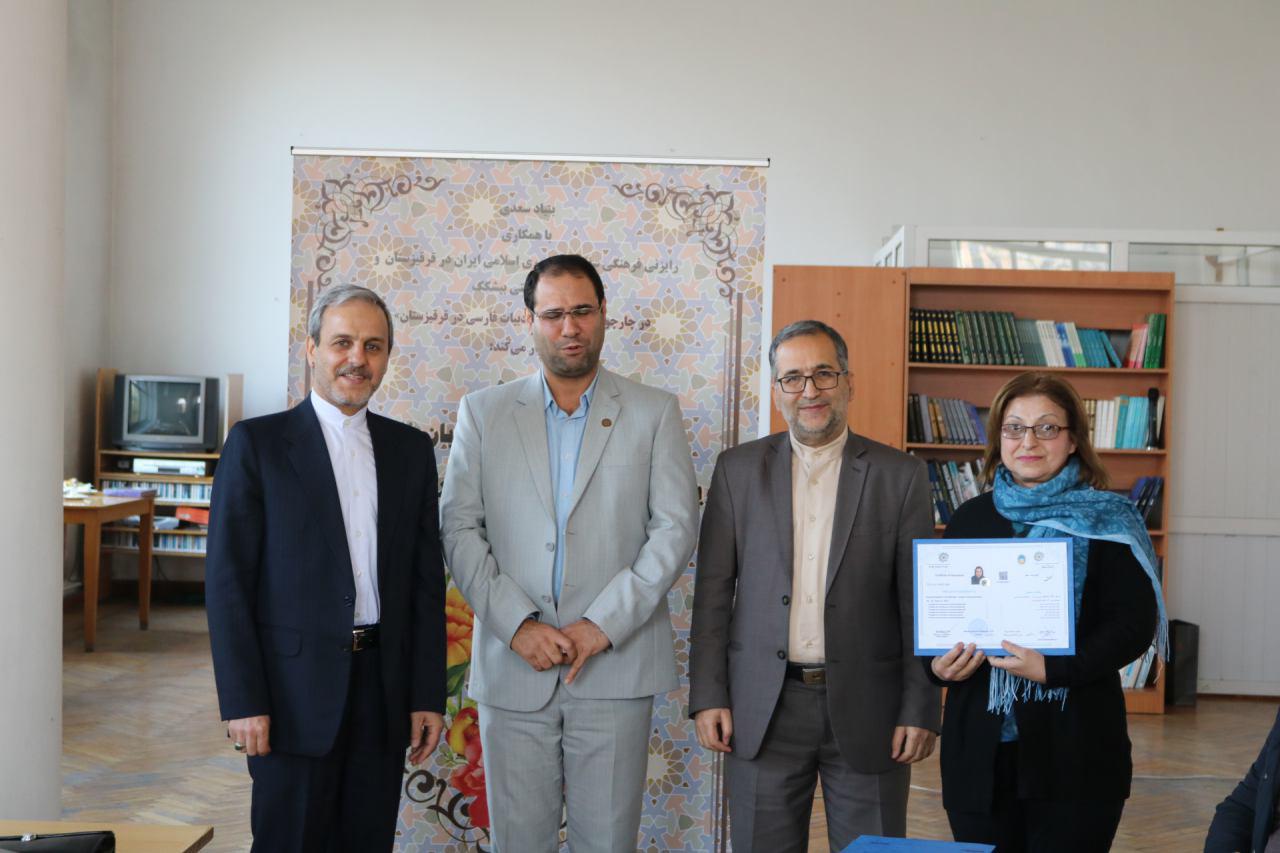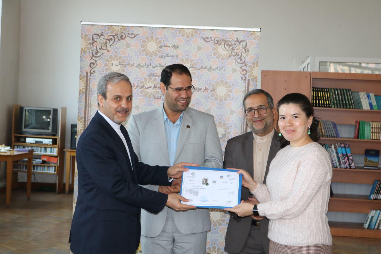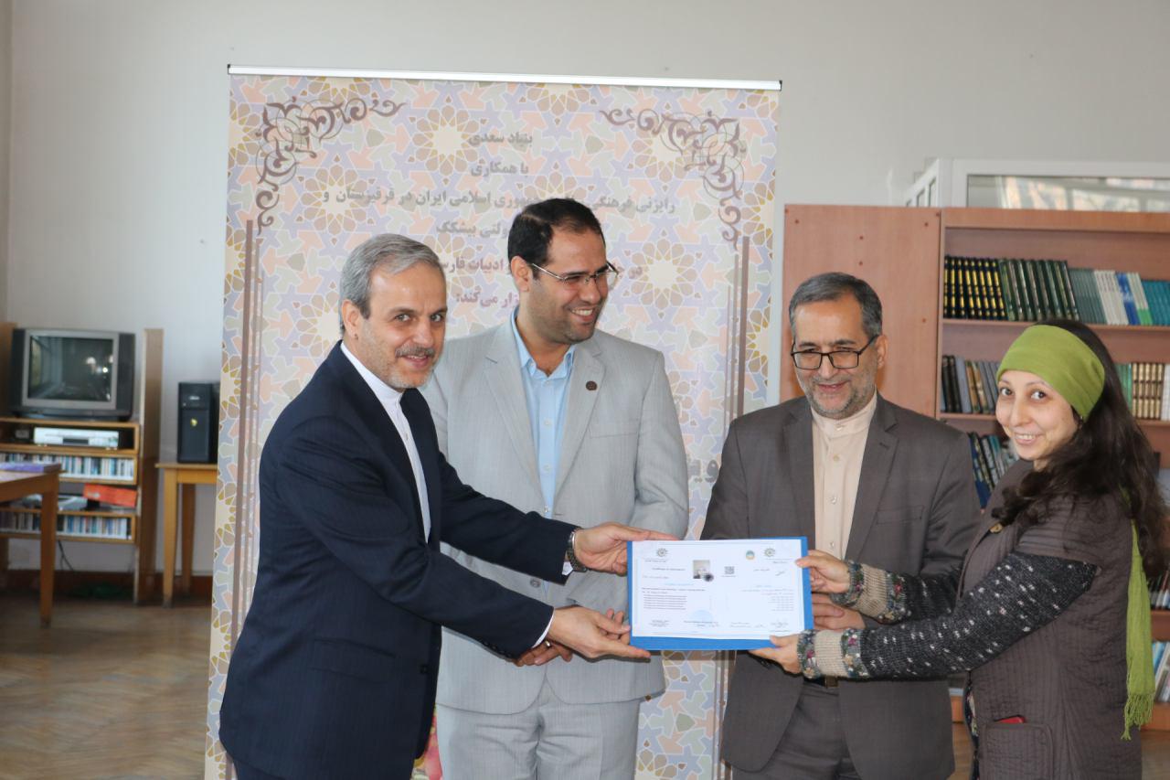 مراسم اختتامیه اولین دوره بازاموزی مدرسان زبان فارسی ویژه استادان زبان فارسی قرفیزستان با اعطای گواهی نامه به ۱۳نفر از شرکت کنندگان دراین دوره توسط سفیرج.ا.ایران درقرفیزستان، دکتر رضا مرادصحرایی معاون اموزش وپژوهش بنیادسعدی و قاسمی رایزن فرهنگی سفارت ج.ا.ایران درقرقیزستان بهپایان رسید.
