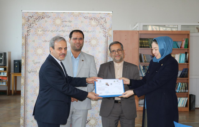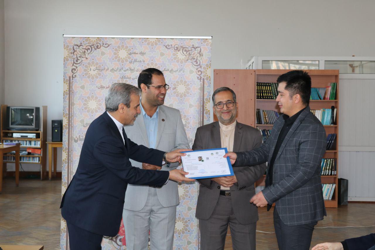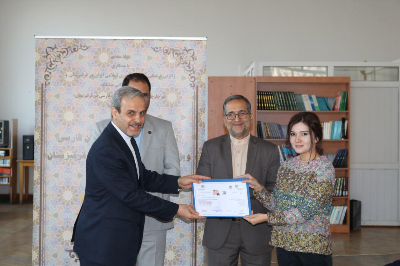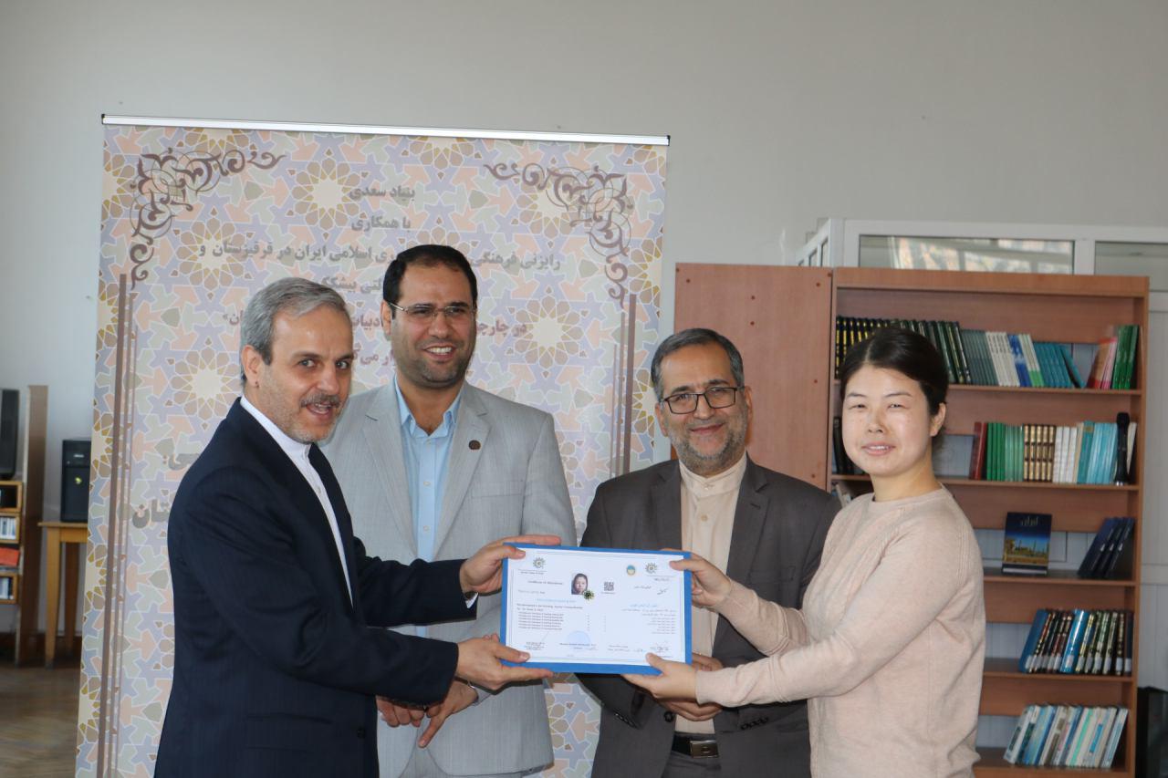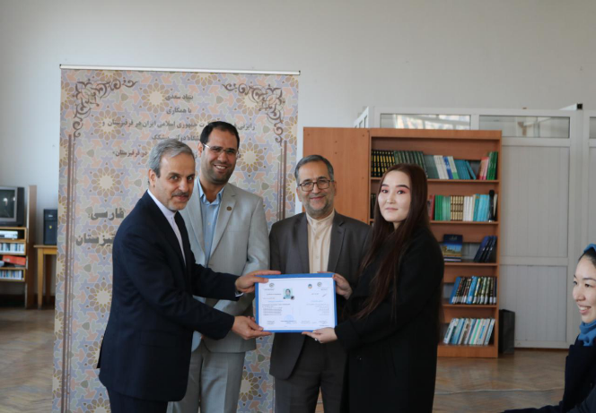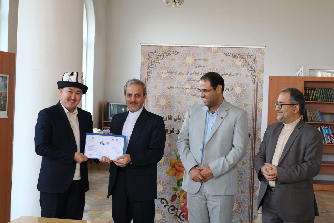 مراسم اختتامیه اولین دوره بازاموزی مدرسان زبان فارسی ویژه استادان زبان فارسی قرفیزستان با اعطای گواهی نامه به ۱۳نفر از شرکت کنندگان دراین دوره توسط سفیرج.ا.ایران درقرفیزستان، دکتر رضا مرادصحرایی معاون اموزش وپژوهش بنیادسعدی و قاسمی رایزن فرهنگی سفارت ج.ا.ایران درقرقیزستان بهپایان رسید.