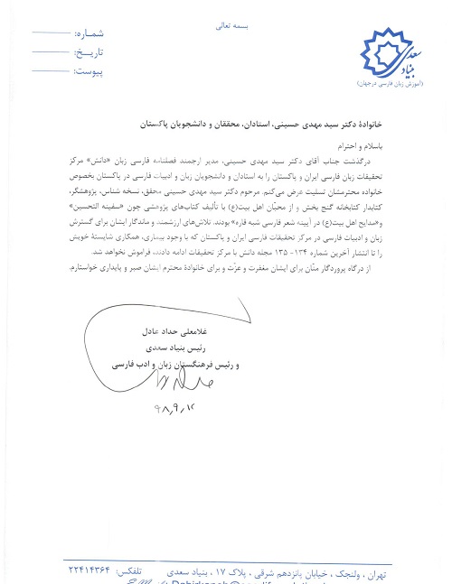 درگذشت جناب آقای سید مهدی حسینی، مدیر ارجمند فصلنامه فارسی زبان «دانش» مرکز تحقیقات زبان فارسی ایران و پاکستان را به استادان و دانشجویان زبان و ادبیات فارسی در پاکستان به خصوص خانواده محترمشان تسلیت عرض میکنم. مرحوم دکتر سید مهدی حسینی محقق، نسخه شناس، پژوهشگر، کتابدار کتابخانه گنج بخش و از محبّان اهل بیت (ع) با تألیف کتابهای پژوهشی چون «سفینه التحسین» و «مدایح اهل بیت(ع) در آیینه شعر فارسی شبه قاره» بودند. تلاشهای ارزشمند و ماندگار ایشان برای گسترش زبان و ادبیات فارسی در مرکز تحقیقات ایران و پاکستان که با وجود بیماری، همکاری شایسته خویش را تا انتشار آخرین شماره 134-135 مجله دانش با مرکز تحقیقات ادامه دادند، فراموش نخواهد شد.