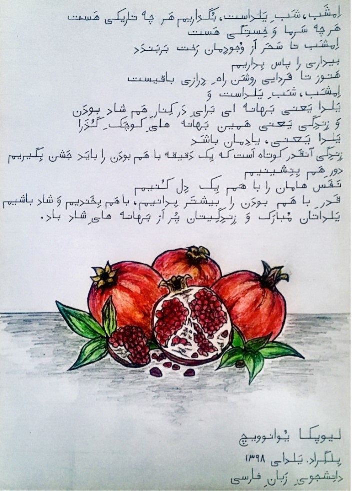 کارگاه آموزش زبان فارسی با همکاری رایزنی فرهنگی کشورمان در مرکز مطالعات فارسی دانشگاه بلگراد برگزار و واژهها و اصطلاحات مربوط به «آیینهای ایرانی و شب یلدا» ارایه شد.