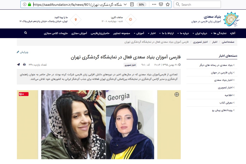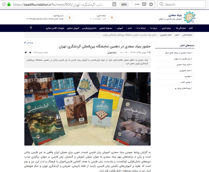 بنیاد سعدی امسال نیز برای سومین سال در نمایشگاه بینا لمللی گردشگری تهران، در بخش بینا لملل حضور دارد و علاوه بر معرفی فعالیتهای آموزش در خارج از کشور و آموزش به غیر فارسی زبانان در فضای مجازی، کتاب ه ای آموزش فارسی را عرضه و به فروش میرساند.