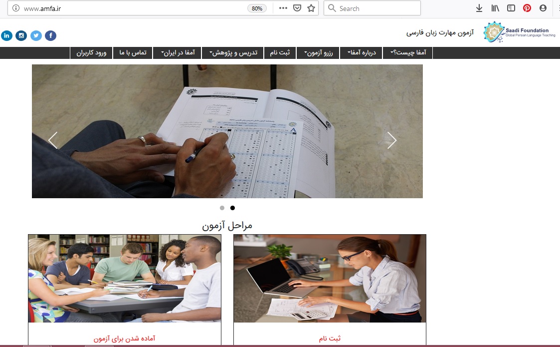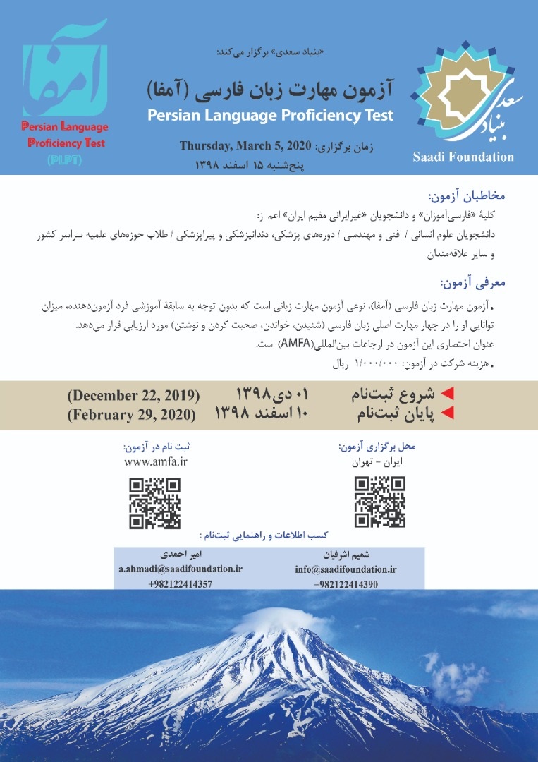 به گزارش روابط عمومی بنیاد سعدی، آزمون مهارت زبان فارسی (آمفا) عمومی ۱۵ اسفند سال جاری (مطابق با پنچم مارس ۲۰۲۰) در ایران برای تمامی فارسی آموزان و غیر ایرانیهای مقیم ایران، اعم از دانشجویان غیر ایرانی و همچنین ایرانیانی که برای مقاصد شغلی و درسی در خارج از کشور نیازمند این مدرک بین المللی هستند، توسط بنیاد سعدی برگزار میشود.