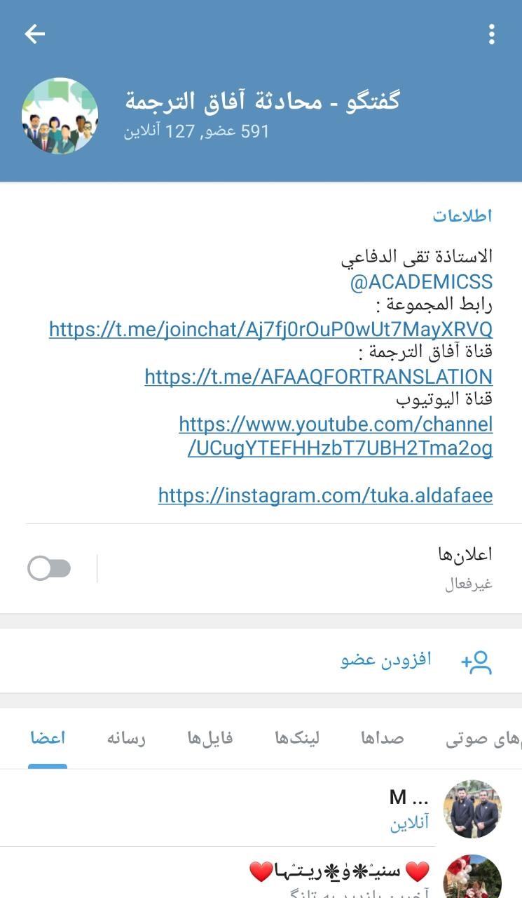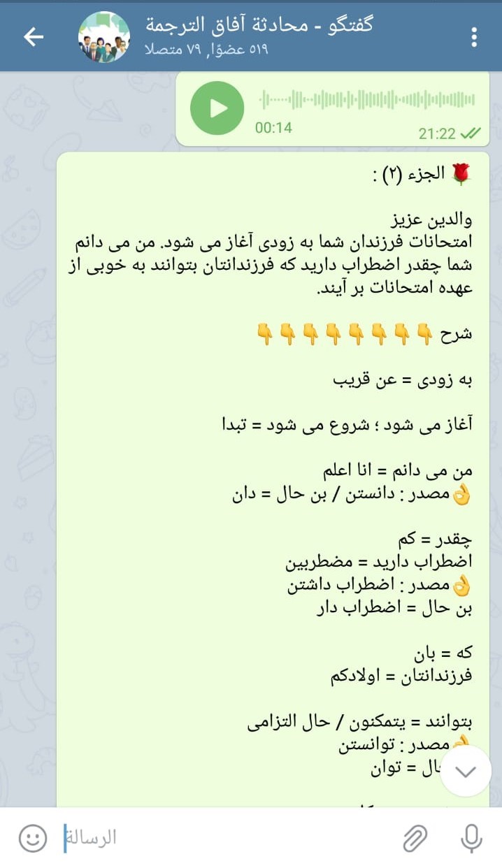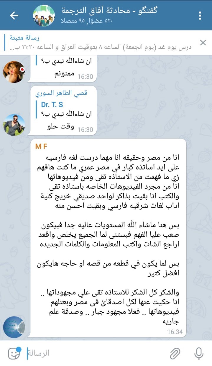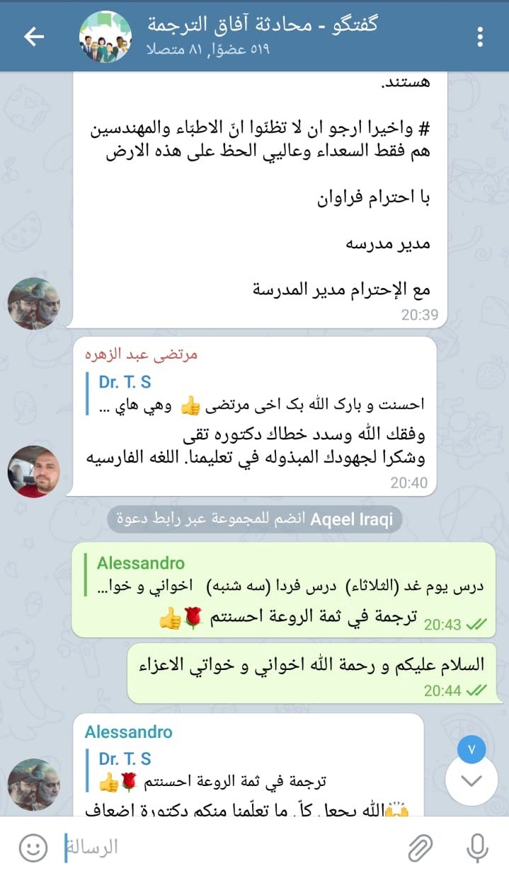 از دیگر اقدامات در این حوزه میتوان به آموزش در کانال تلگرامی با نام" محادثه آفاق الترجمه" که توسط یکی از مدرسین رایزنی فرهنگی راه اندازی شده اشاره کرد، این کانال تعدادی بالغ بر ۵۰۰ عضو دارد و مدرس در یک ساعت مشخصی به آموزش زبان فارسی می پردازد.