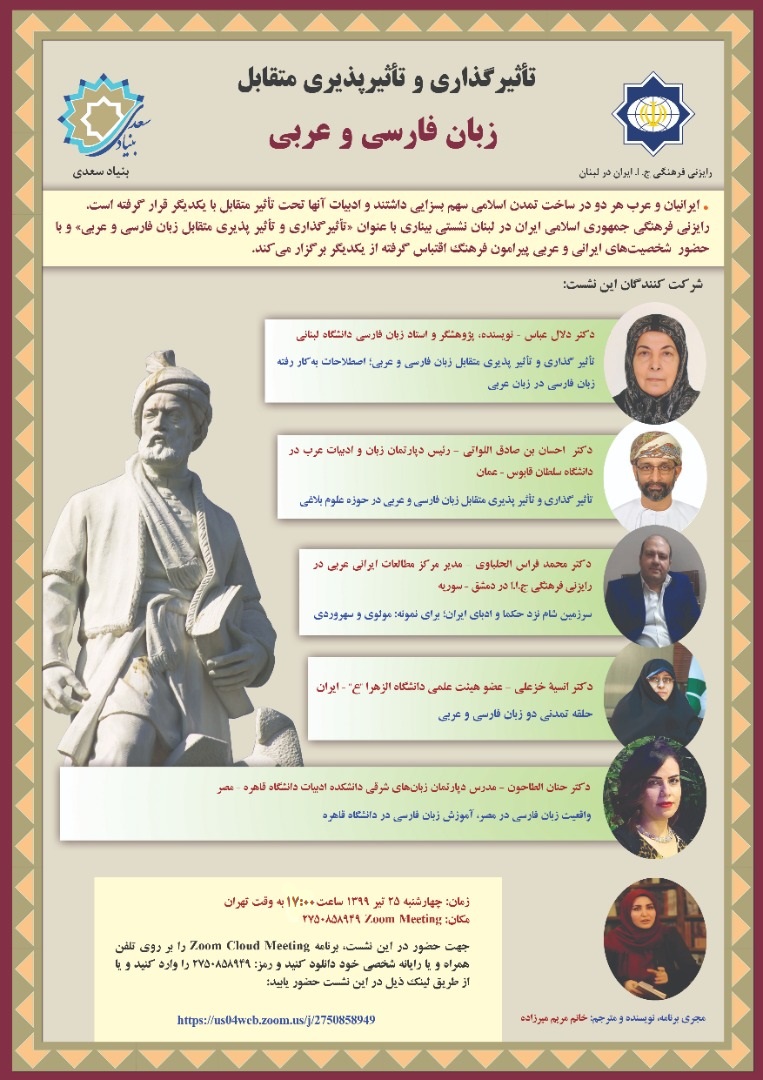 رایزنی فرهنگی ایران و نمایندگی بنیاد سعدی در لبنان به مناسبت روز گفتگو و تعامل سازنده با جهان، نشست وبیناری با عنوان «تأثیرگذاری و تأثیرپذیری متقابل زبان فارسی و عربی» برگزار کرد.