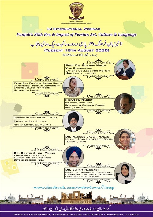 به همت مدیر گروه زبان و ادبیات فارسی دانشگاه بانوان لاهور، وبینار بین المللی با عنوان «تاثیر زبان، فرهنگ و هنر پارسی در دوره حاکمیت های سیک های پنجاب» در روز سه شنبه ۱۸ اوت ۲۰۲۰، ۲۸ مرداد ساعت ۹ صبح به وقت ایران برگزار می شود.