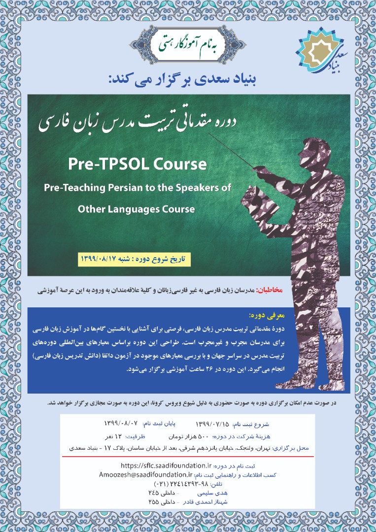 دوره مقدماتی تربیت مدرس زبان فارسی به غیر فارسی زبانان برای کلیه مدرسان زبان فارسی و علاقهمندان به آموزش زبان فارسی در بنیاد سعدی برگزار میشود.