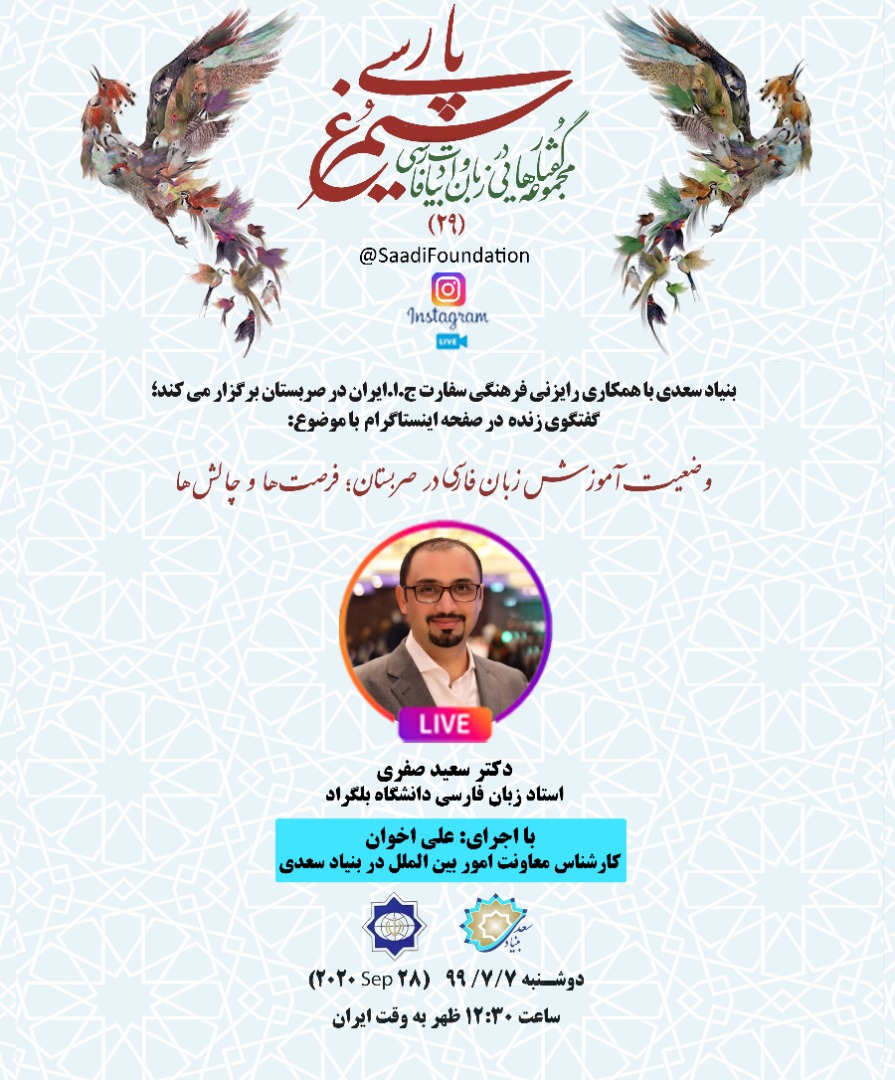 گفتگوی "سیمرغ پارسی" با عنوان "وضعیت آموزش زبان فارسی در صربستان؛ فرصتها و چالشها" با دکتر سعید صفری، استاد زبان فارسی دانشگاه بلگراد در فضای مجازی اینستاگرام بنیاد سعدی برگزار شد.