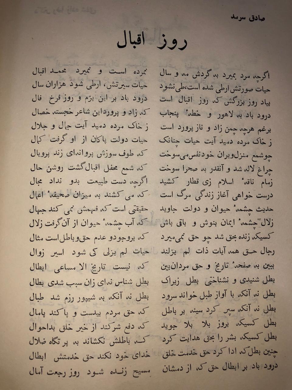 روز (۹ نوامبر) سالروز تولد علامه اقبال لاهوری، شاعر، سیاستمدار، فیلسوف و متفکر مسلمان پاکستانی است که به زبان فارسی میاندیشد و اشعار زیادی به زبانهای فارسی و اردو سروده است.