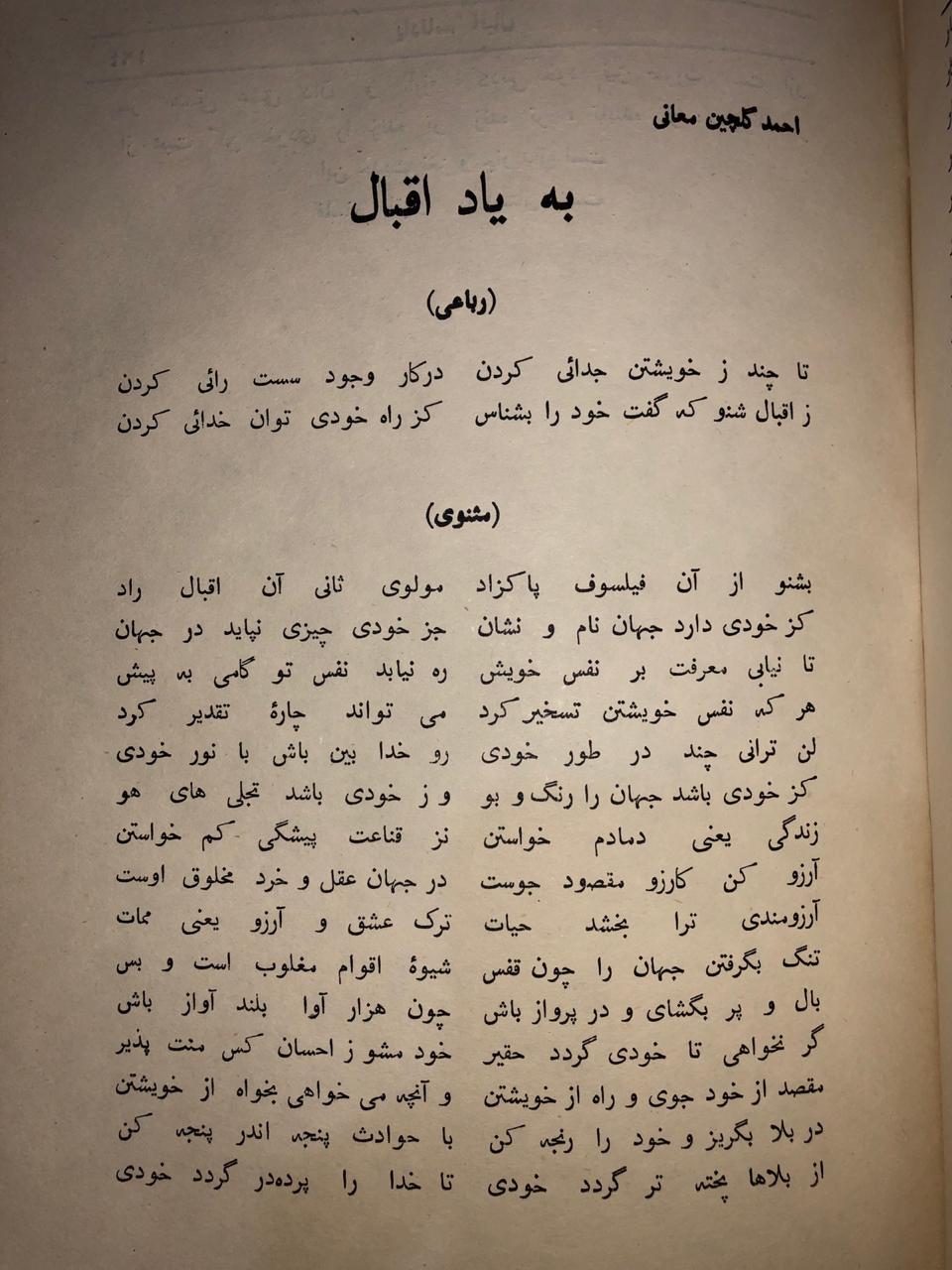 فطرت اندیشه او با سعدی، سنایی و مولانا آمیخته شد. نکته مهم دیگر این است که فارسی زبان عشق است. این یک واقعیت است که شعری که به شیرینی فارسی گفته میشود، کمتر میتوان به زبانهای دیگر گفت. امروز نیز بدون شک از جمله بزرگترین شاعران جهان، شاعران فارسیزبان هستند، بزرگترین و پرمخاطبترین کتاب شعر در جهان مثنوی است و به زبان فارسی است، امروز هم استقبال از این سرودهها به اندازهای صورت میگیرد که ۱۰۰ سال پیش بود. در جهان امروز هیچ شاعری با این استقبال مواجه نشده که مولوی میشود. فارسی زبان عشق و شعر است؛ به همین دلیل اقبال به زبان فارسی روی میآورد تا اندیشههای خود را بیان کند: