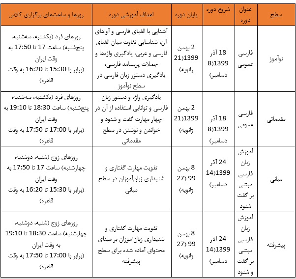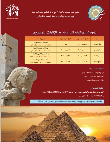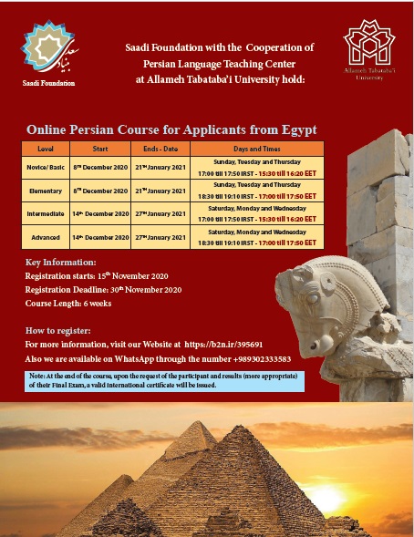 به گزارش روابط عمومی بنیاد سعدی، در جهت ترویج و گسترش ارتباط فرهنگی بین دو کشور ایران و مصر و همچنین تقویت و گسترش زبان فارسی در کشور مصر، بنیاد سعدی با همکاری مرکز آموزش زبان فارسی به غیرفارسیزبانان (آزفا) دانشگاه علامه طباطبایی در نظر دارد آذر و دی ماه سال جاری دورۀ آموزش زبان فارسی را در بیست جلسه (۵۰ دقیقهای) ویژۀ متقاضیان مصری در سه سطح «نوآموز، مقدماتی، میانی و پیشرفته» به صورت برخط (آنلاین) به شرح زیر برگزار کند: