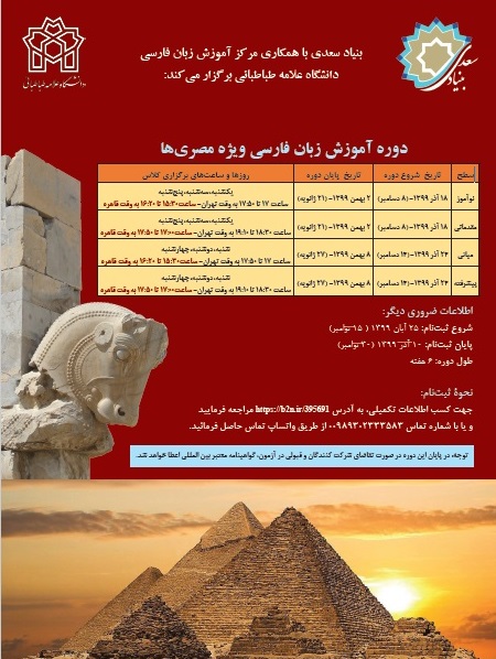 بنیاد سعدی با همکاری مرکز آموزش زبان فارسی به غیرفارسیزبانان (آزفا) دانشگاه علامه طباطبایی، دوره آموزش زبان فارسی ویژه فارسی آموزان مصری را به صورت بر خط در آذر و دی ماه سال جاری برگزار میکند.