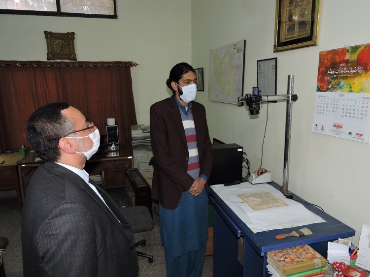 وی ضمن بازدید از گنجینه کتابخانه ”گنج بخش“ و نسخ خطی و کتاب های سنگی، از نزدیک با مراحل نسخه برداری، اسکن نسخ خطی، کتب و نحوه نگهداری کردن آشنا شد.