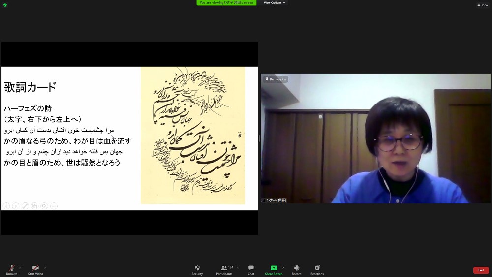 در بخش دیگری از این برنامه، خانم هیساکو تسونودا چند شعر و جمله فارسی را به زیبایی با قلم، خوشنویسی کرد و در پایان نیز نماهنگ زیبایی در معرفی هنرهای مختلف ایرانی از جمله خوسنویسی، نقاشی، منبت کاری، قلم زنی و … به همراه موسیقی ایرانی پخش شد.