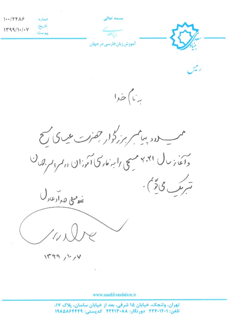 رئیس بنیاد سعدی، در پیامی سالروز میلاد حضرت عیسی (ع)، پیامبر صلح و دوستی و آغاز سال ۲۰۲۱ مسیحی را به فارسیآموزان سراسرجهان تبریک گفت.