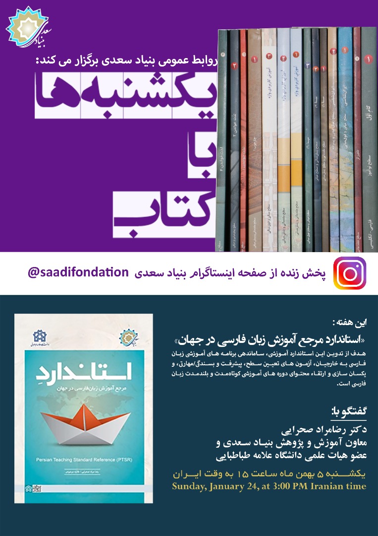در برنامه زنده اینستاگرامی «یکشنبه ها با کتاب» بنیاد سعدی، این هفته معاون آموزش و پژوهش بنیاد سعدی به معرفی کتاب «استاندارد مرجع آموزش زبان فارسی در جهان» میپردازد.