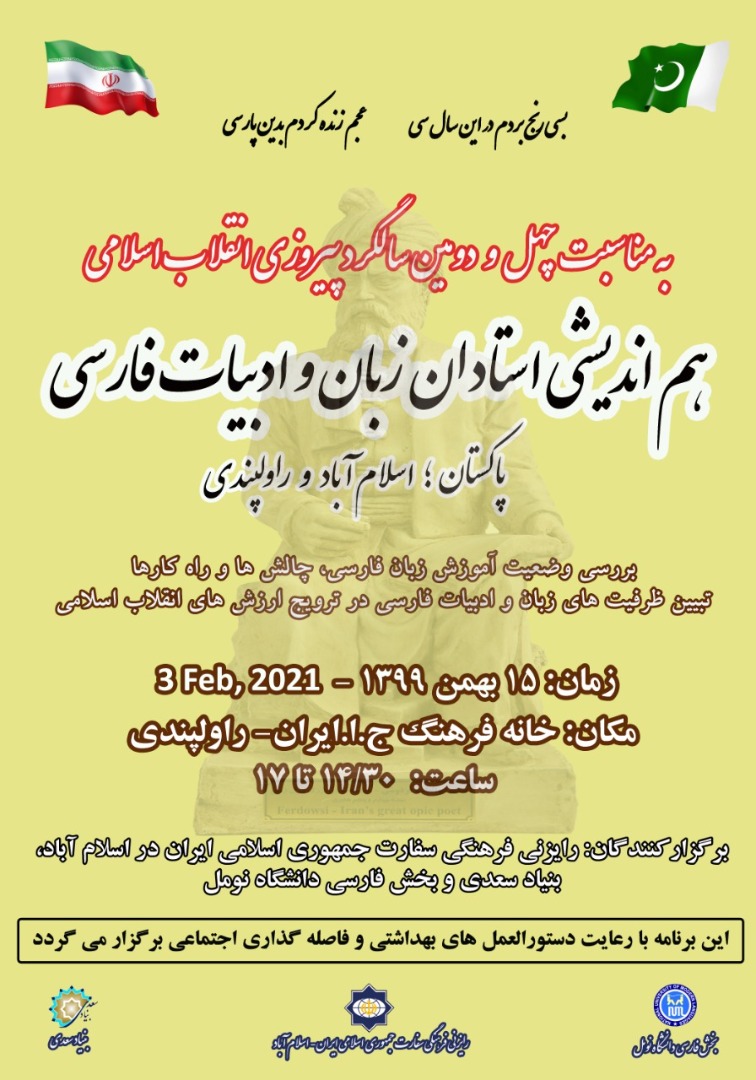 به گزارش روابط عمومی بنیاد سعدی، همزمان با دهه فجر انقلاب اسلامی، گردهمایی استادان زبان و ادبیات فارسی، چهارشنبه ۱۵ بهمن ماه ۱۳۹۹ از سوی رایزنی فرهنگی ایران و نماینده بنیادسعدی در اسلام آباد با مشارکت و همکاری بنیاد سعدی و بخش زبان فارسی دانشگاه زبانهای خارجی نومل اسلام آباد در سالن اجتماعات خانه فرهنگ ایران در راولپندی برگزار می شود.