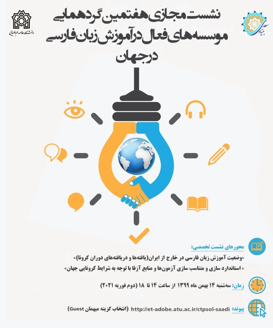به منظور هم افزایی در آموزش و گسترش زبان فارسی در جهان، بنیاد سعدی هفتمین گردهمایی سالانه مؤسسههای فعال در آموزش زبان فارسی در جهان را با همکاری دانشگاه علامه طباطبایی و با توجه به شرایط خاص دوران کرونا، به صورت مجازی برگزار میکند.