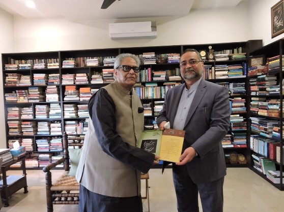 در پایان این دیدار رایزن فرهنگی به همراه آقای افتخار عارف از کتابخانه و مجموعه کتاب های فارسی در کتابخانه شخصی وی بازدید بعمل آورد و یک نسخه از شماره های اخیر منشورات رایزنی فرهنگی و مرکز تحقیقات فارسی ایران و پاکستان و همچنین هدیه و سوغاتی از ایران به عنوان یادبود این دیدار به وی تقدیم کرد. افتخار حسین عارف نیز مجموعه آثار منتشر شده خود را به رایزن فرهنگی اهدا کرد.