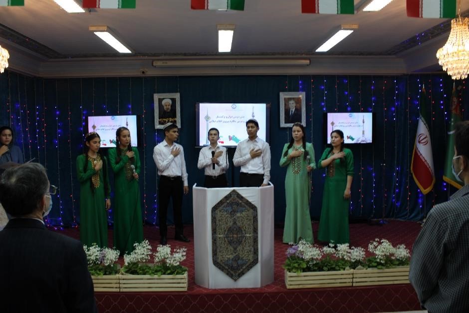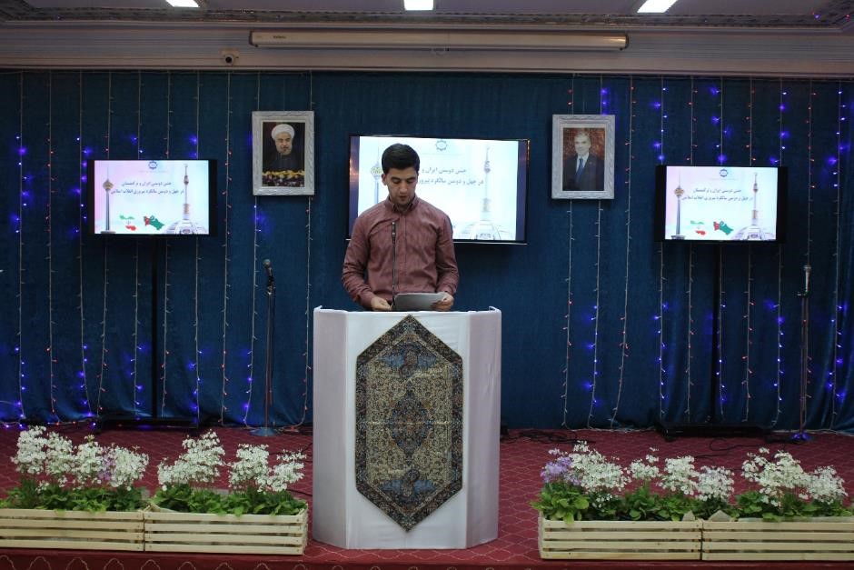 به گزارش روابط عمومی بنیاد سعدی، در این جشن که به همت رایزنی فرهنگی کشورمان و با حضور نوید رسولی سرپرست رایزنی فرهنگی، حسن صالح مجد کارشناس دیپلماسی عمومی سفارت ج. ا. ایران در ترکمنستان، تعدادی از کارکنان سفارت، ایرانیان مقیم عشقآباد، فارسی آموزان و علاقه مندان ترکمن و خانوادههای آنها برگزار شد، پس از تلاوت آیاتی از قرآن کریم، سرود ملی دو کشور توسط گروه سرود رایزنی فرهنگی به صورت زنده اجرا شد سپس نوید رسولی سرپرست رایزنی فرهنگی ایران در ترکمنستان در سخنانی برگزاری این جشن را در راستای سیاستهای ایران و سخنان مسئولان دو کشور مبنی بر اعلام رابطهای فراتر از همسایگی بین دو کشور در چهل و دومین سالگرد پیروزی انقلاب اسلامی دانست.