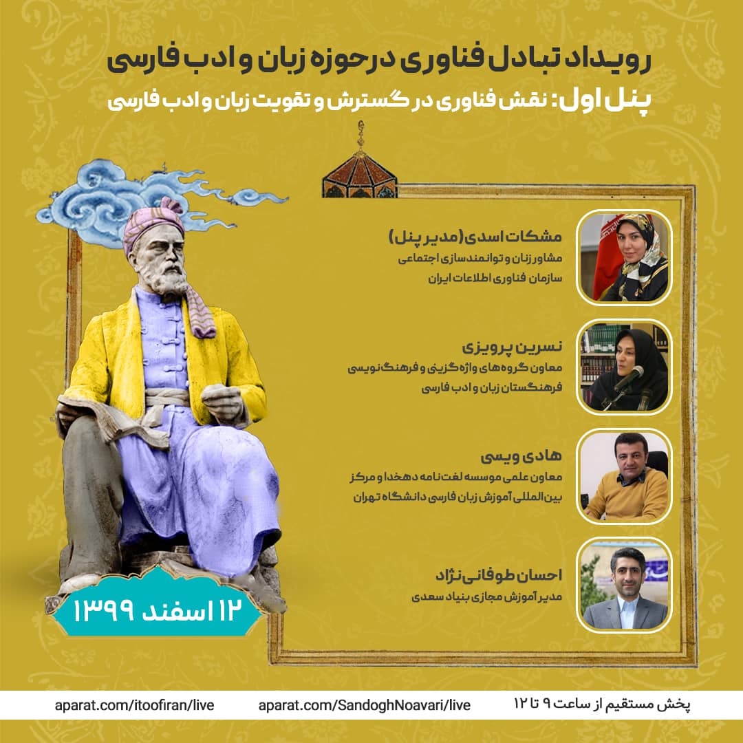در اولین پنل این رویداد با موضوع «نقش فناوری در گسترش و تقویت زبان و ادب فارسی» مشکات اسدی (مدیر پنل) مشاور زنان و توانمندسازی اجتماعی سازمان فناوری اطلاعات ایران، نسرین پرویزی معاون گروههای واژه گزینی و فرهنگ نویسی فرهنگستان زبان و ادب فارسی، هادی ویسی معاون علمی مؤسسه لغت نامه دهخدا و مرکز بینالمللی آموزش زبان فارسی دانشگاه تهران و احسان طوفانی نژا د مدیر آموزش مجازی بنیاد سعدی به ارائه سخن پرداختند.