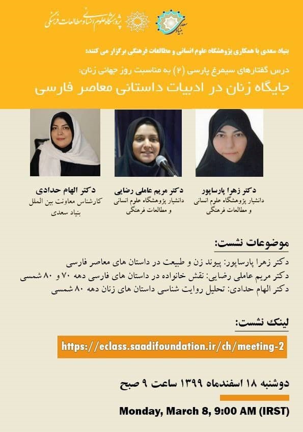به گزارش روابط عمومی بنیاد سعدی، روز جهانی زن فرصت خوبی است تا اهمیت جایگاه زنان در ادبیات داستانی ایران مورد بررسی قرار گیرد، به همین مناسبت بنیاد سعدی با همکاری پژوهشگاه علوم انسانی و مطالعات فرهنگی، درس گفتارهای سیمرغ پارسی را به صورت مجازی برگزار می کند.