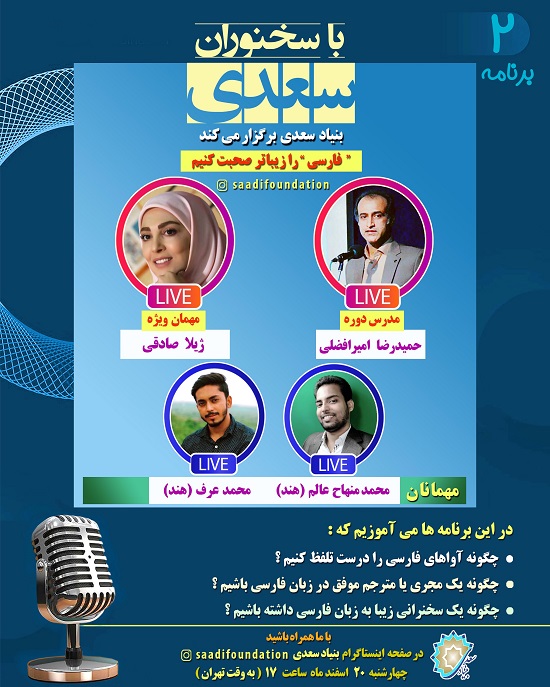 به گزارش روابط عمومی بنیاد سعدی، برنامه «با سخنوران سعدی» که به منظور افزایش مهارت فن بیان و سخنوری فارسی آموزان و بیان شیواتر واژههای فارسی از صفحه اینستاگرام بنیاد سعدی برگزار میشود، در دومین برنامه خود میزبان ژیلا صادقی، مجری و گوینده و محمد منهاح عالم و محمد عرف، فارسی آموزان اهل هندوستان خواهند بود.