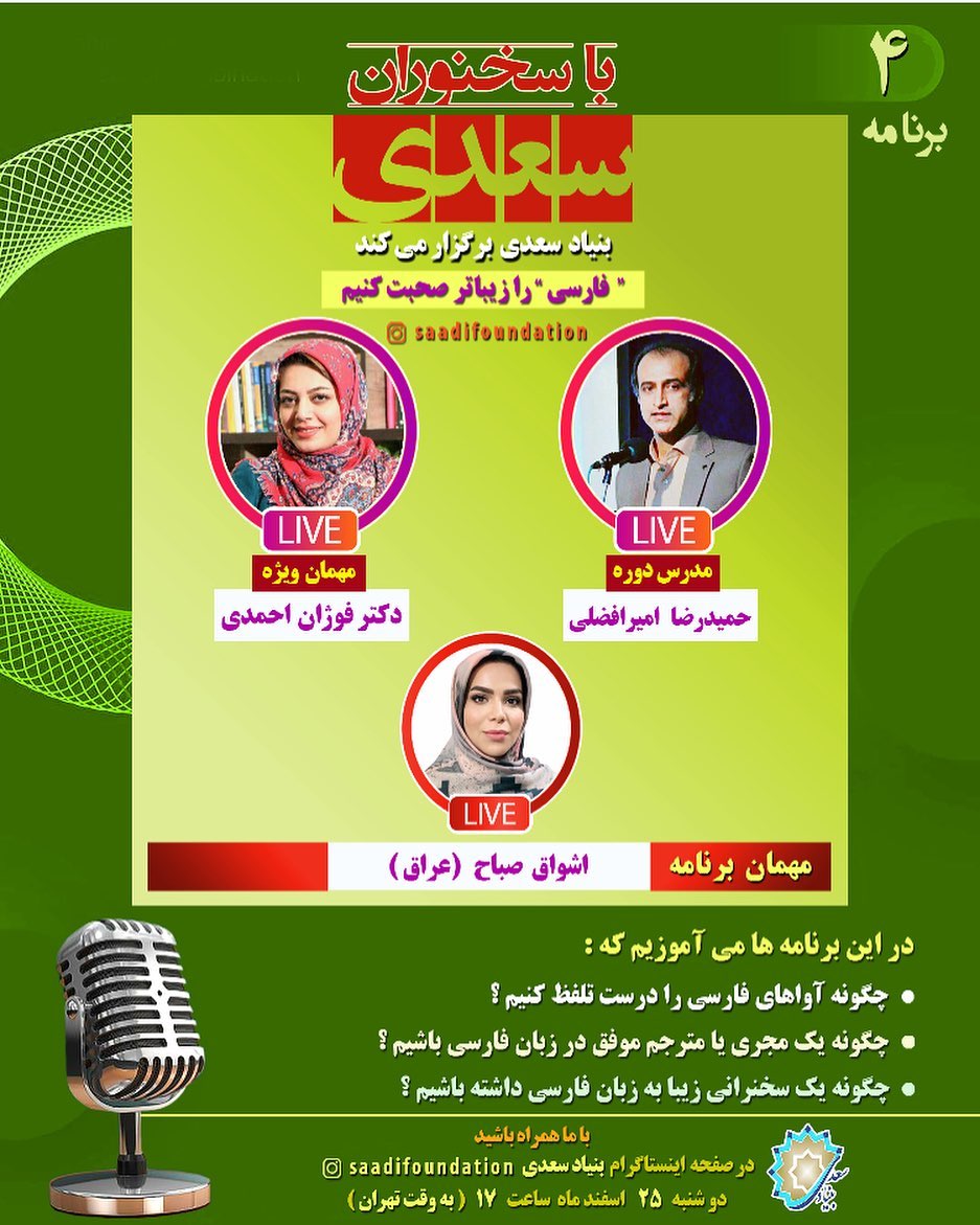 همچنین در هر برنامه قرار است «یکی از مجریان و گویندگان رادیو و تلویزیون و یا بازیگران ایران به عنوان مهمان ویژه برای کسب تجارب آنها» و «یک یا دو نفر از فارسیآموزان داوطلب برای شرکت در برنامه برای انجام آموزشهای فن بیان» حضور داشته باشند. علاقهمندان برای مشاهده این برنامه میتوانند امروز دوشنبه ۲۵ اسفند ۱۳۹۹ ساعت ۱۷ (به وقت تهران) به صفحه اینستاگرام بنیاد سعدی به آدرس saadifoundation@ مراجعه کنند.