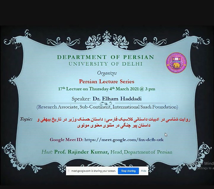 بنیاد سعدی با همکاری گروه زبان و ادبیات فارسی دانشگاه دهلی- هندوستان نشستی با عنوان «روایت شناسی در ادبیات کلاسیک فارسی با محوریت داستان حسنک وزیر در تاریخ بیهقی و داستان پیر چنگی از مثنوی مولوی» برگزار کرد.