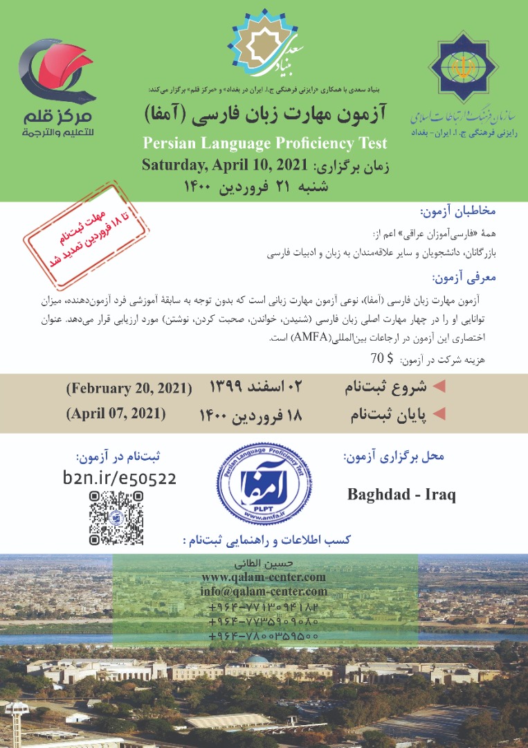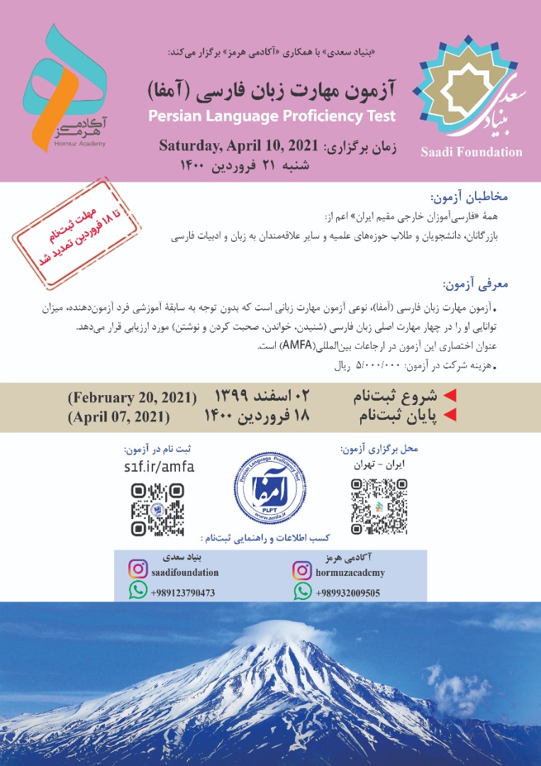 فرایند ثبت نام دومین آزمون بینالمللی مهارت زبان فارسی «آمفا» ۱۴۰۰ که از اسفند ماه سال پیش در کشورهای ایران، روسیه و عراق آغاز شده بود، تا ساعت ۲۴ روز ۱۸ فروردین تمدید شد.