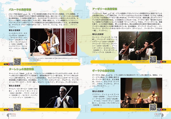 در بخش معرفی «استانهای ایران»، کردستان به عنوان قطب موسیقی کشور و سنندج به عنوان پایتخت موسیقی ایران معرفی شده و در بخش «شناخت اسلام» هم اذان به همراه ترجمه، مؤذنهای معروف ایران، سبکهای اذان خوانی و … به طور نمونه صدای دلنشین استاد موذن زاده در قالب (QR) ارائه شده است.