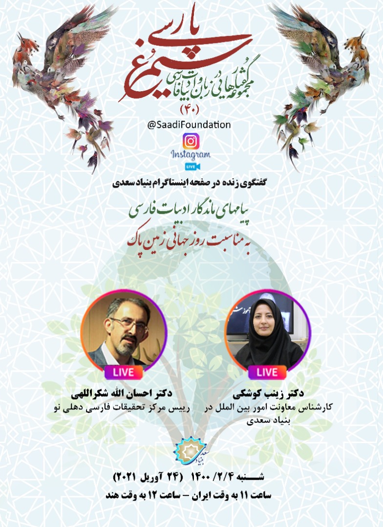 چهلمین نشست اینستاگرامی «سیمرغ پارسی» با موضوع «پیامهای ماندگار ادبیات فارسی»، این بار به به مناسبت روز جهانی زمین پاک، چهارم اردیبهشت ۱۴۰۰ به صورت زنده از صفحه بنیاد سعدی برگزار میشود.