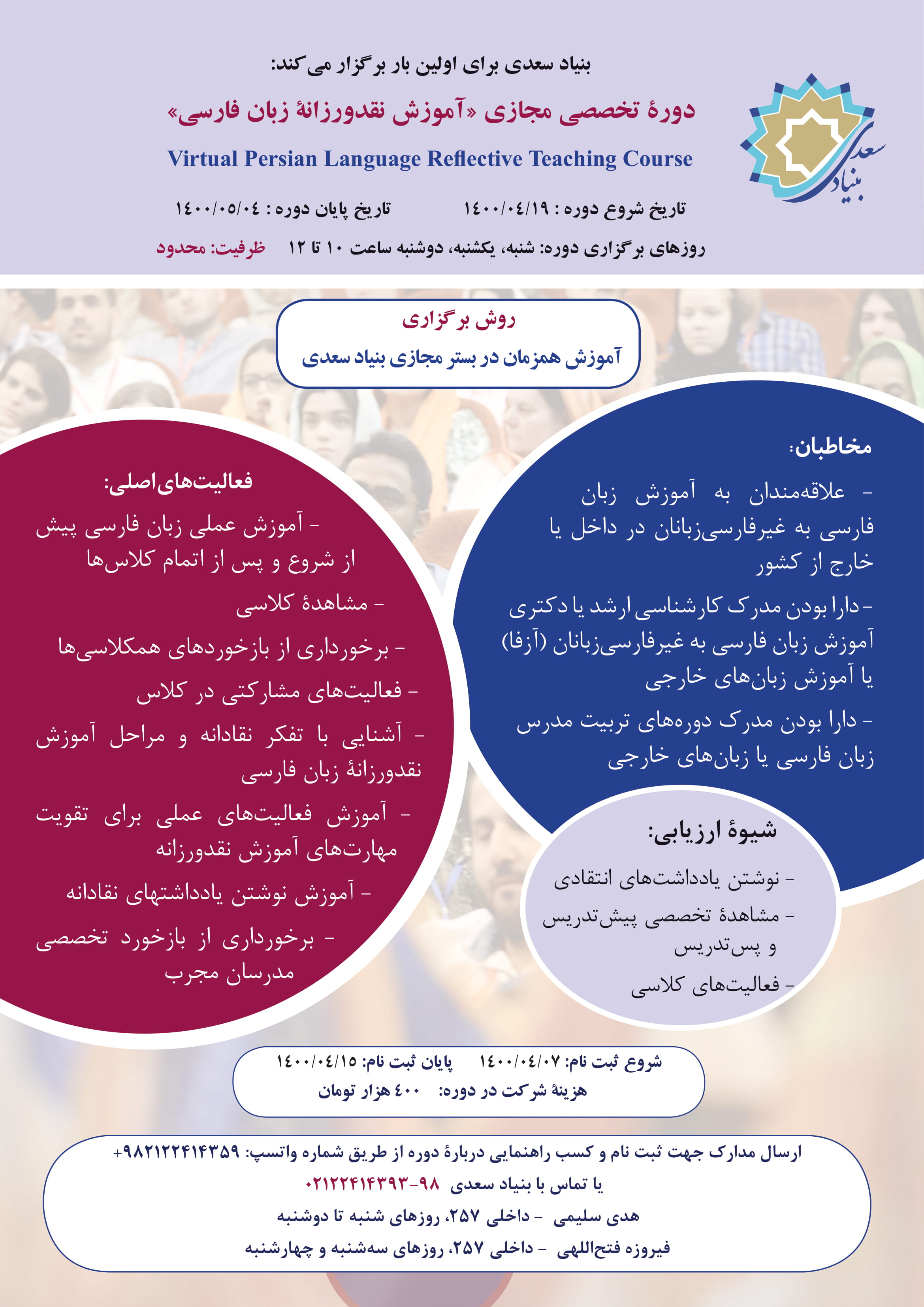 علاقه مندان جهت دریافت راهنمایی دربارة دوره و ثبت نام، میتوانند از راه واتساپ ۹۸۲۱۲۲۴۱۴۳۵۹+ و یا شماره تلفن با بنیاد سعدی ۹۸-۰۲۱۲۲۴۱۴۳۹۳ تماس گرفته و روزهای شنبه، یکشنبه و دوشنبه با هدی سلیمی - داخلی ۲۵۷ و روزهای سهشنبه و چهارشنبه با فیروزه فتحاللهی – داخلی ۲۵۷ اطلاعات بیشتری کسب کنند.
