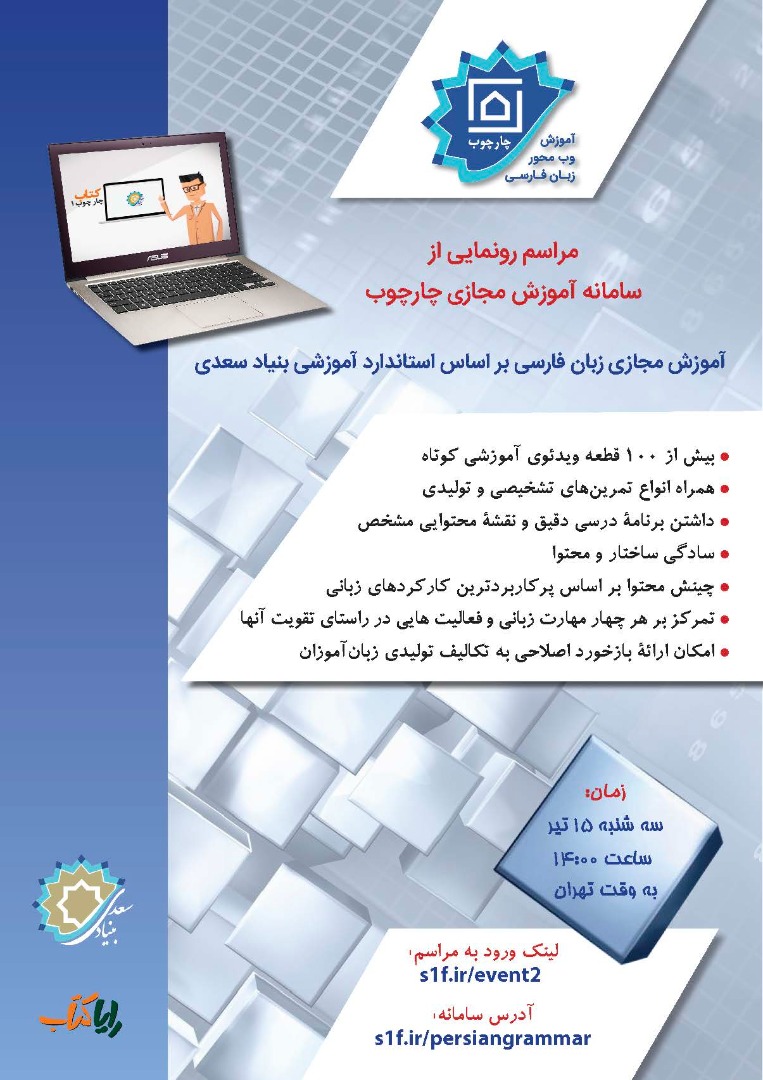 علاقهمندان میتوانند فیلم معرفی آموزش وب محور زبان فارسی «چارچوب» را از اینجا (https://s1f.ir/persiangrammar) مشاهده و برای حضور مجازی در مراسم رونمایی از راه لینک https://s1f.ir/event2 وارد شوند.