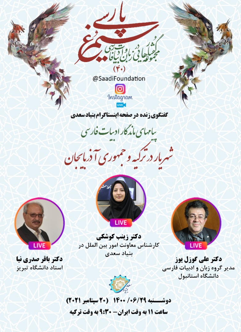 گفتوگوی زنده تصویری در قالب سلسله نشست های سیمرغ پارسی (پیامهای ماندگار ادبیات فارسی) با موضوع «شهریار در ترکیه و جمهوری آذربایجان» در صفحه اینستاگرام بنیاد سعدی برگزار میشود.