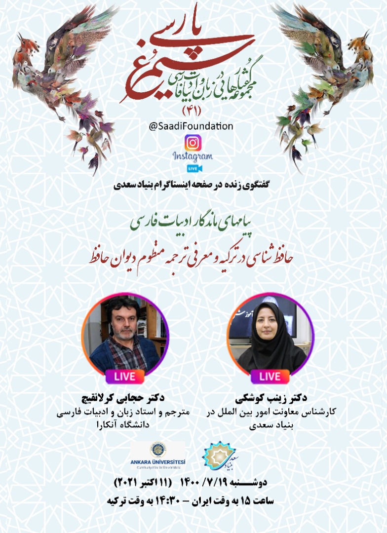 گفتوگوی زنده تصویری در قالب سلسله نشست های سیمرغ پارسی (پیامهای ماندگار ادبیات فارسی) با موضوع «حافظ شناسی در ترکیه و معرفی ترجمه منظوم دیوان حافظ» در صفحه اینستاگرام بنیاد سعدی برگزار میشود.