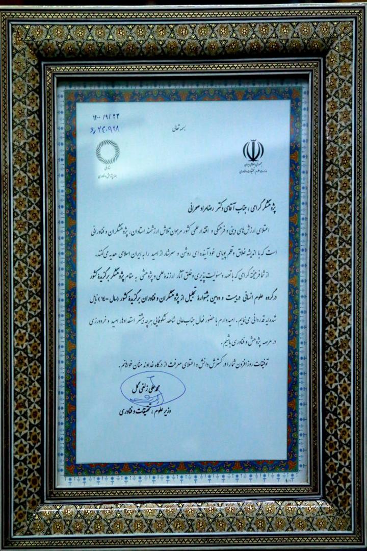 به گزارش روابط عمومی بنیاد سعدی، ۲۵ آذر ماه در سومین روز از مراسم هفته پژوهش، فناوری و فن بازار با حضور محمدعلی زلفی گل، وزیر علوم، تحقیقات و فناوری و سورنا ستاری، معاون علمی و فناوری رییسجمهوری، سردار احمد وحیدی، وزیر کشورو حمید سجادی، وزیر ورزش و جوانان، از برترینهای حوزههای پژوهشگران، فناوران، نشریات برتر و انجمنهای برتر و اساتید با بیشترین همکاری با صنعت تقدیر بهعمل آمد و در بخش پژوهشگران برتر، دکتر رضا مراد صحرایی موفق به کسب عنوان پژوهشگر برتر کشوری در حوزه علوم انسانی شد.