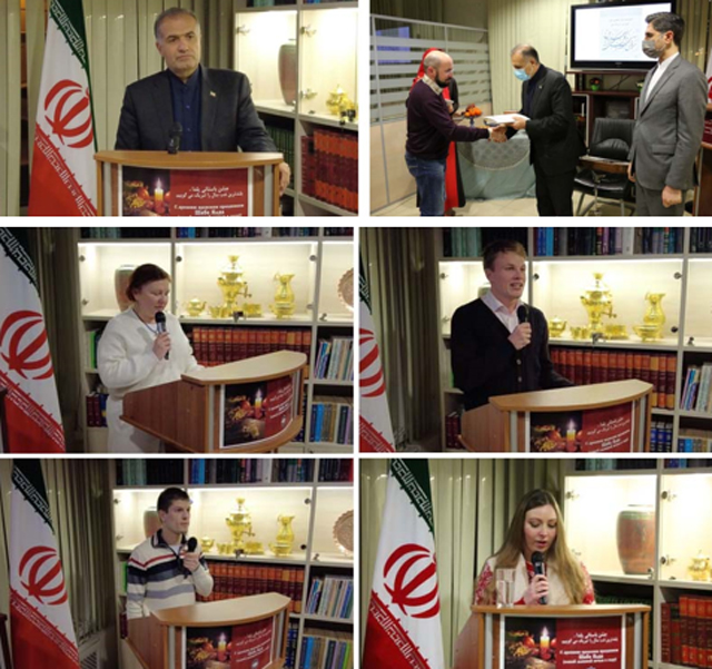 به گزارش روابط عمومی بنیاد سعدی، به مناسبت شب یلدا، مراسم شب شعر و ادب فارسی همزمان با اختتامیه دوازدهمین دوره آموزش زبان فارسی با حضور کاظم جلالی، سفیر و مسعود احمدوند، رایزن فرهنگی ایران و نماینده بنیاد سعدی در روسیه در محل این نمایندگی فرهنگی در مسکو برگزار شد.