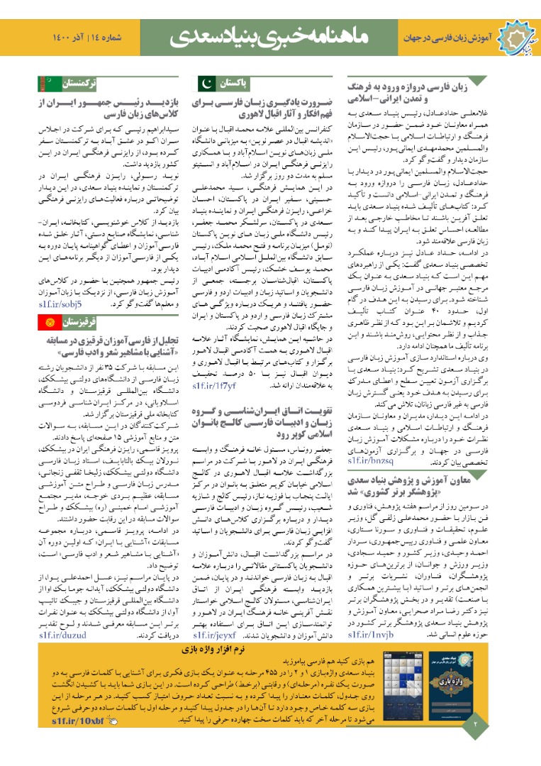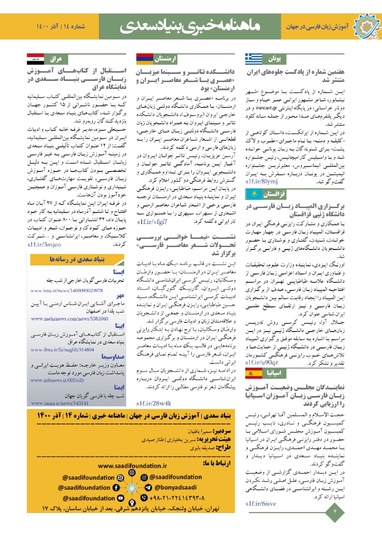 چهاردهمین «ماهنامه خبری آموزش زبان فارسی به غیر فارسی زبانان» به مهمترین اخبار آذرماه ۱۴۰۰ بنیاد سعدی و نمایندگیهای بنیاد سعدی در رایزنیهای فرهنگی سراسر جهان پرداخته است.