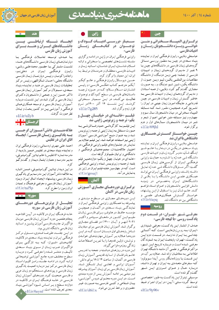 بازدید رئیس جمهور ایران از کلاسهای زبان فارسی، برگزاری دورههای مجازی آموزش زبان فارسی در آلمان، تجلیل از برترینهای دورههای آموزش زبان فارسی در سوریه، ایجاد شبکه ارتباطی بین دانشگاههای ایران و هند برای آموزش زبان فارسی، استقبال از کتابهای آموزش زبان فارسی بنیاد سعدی در نمایشگاه عراق، برگزاری المپیاد زبان فارسی در دانشگاه ژنپی قزاقستان، نمایندگان مجلس وضعیت آموزش زبان فارسی زبان آموزان اسپانیا را ارزیابی کردند، علاقهمندی دانشآموزان گرجی به یادگیری زبان فارسی / ایجاد اتاق ایران در تفلیس و… نیز از دیگر مطالب منتشر شده در بخش «آموزش زبان فارسی در جهان» است.
