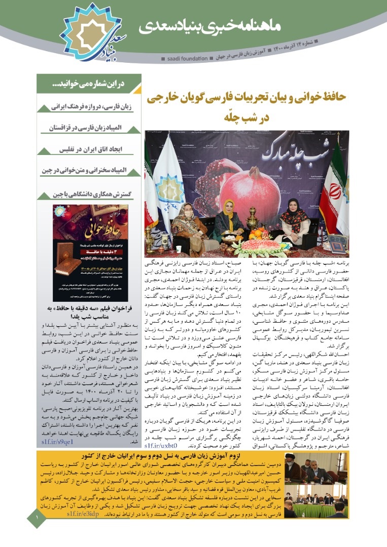 به گزارش روابط عمومی بنیاد سعدی، در این شماره همراه با عناوینی همچون «لزوم آموزش زبان فارسی به نسل دوم و سوم ایرانیان خارج از کشوردر نشستی دبیران کارگروههای تخصصی با حضور وزیر امور خارجه»، «حافظ خوانی و بیان تجربیات فارسیگویان خارجی از شب چله با حضور سوگل مشایخی، مدرس دورههای مثنوی و حافظ»، «استقبال از کتابهای آموزش زبان فارسی بنیاد سعدی در نمایشگاه کتاب عراق» به چاپ رسیده است.