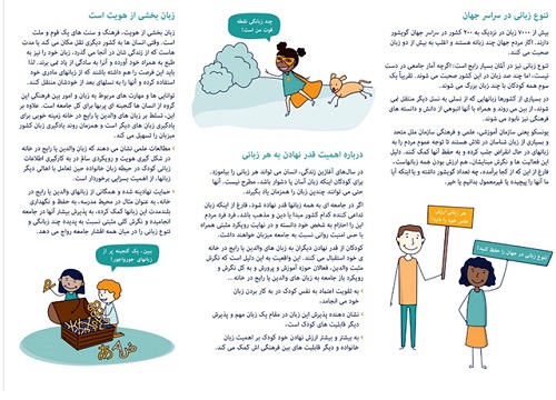 وی «با کودکان به زبان (های) خودتان صحبت کنید»، «غلبه بر پیش داوریها و بهره از فایدهها»، «حتی با وجود اختلال زبانی و گفتاری»، «کتاب خواندن برای کودک رشد زبانی او را تقویت میکند» و «قدر هر زبانی را بدانید» را عناوین بروشورهای پنجگانه معرفی زبان فارسی برشمرد.