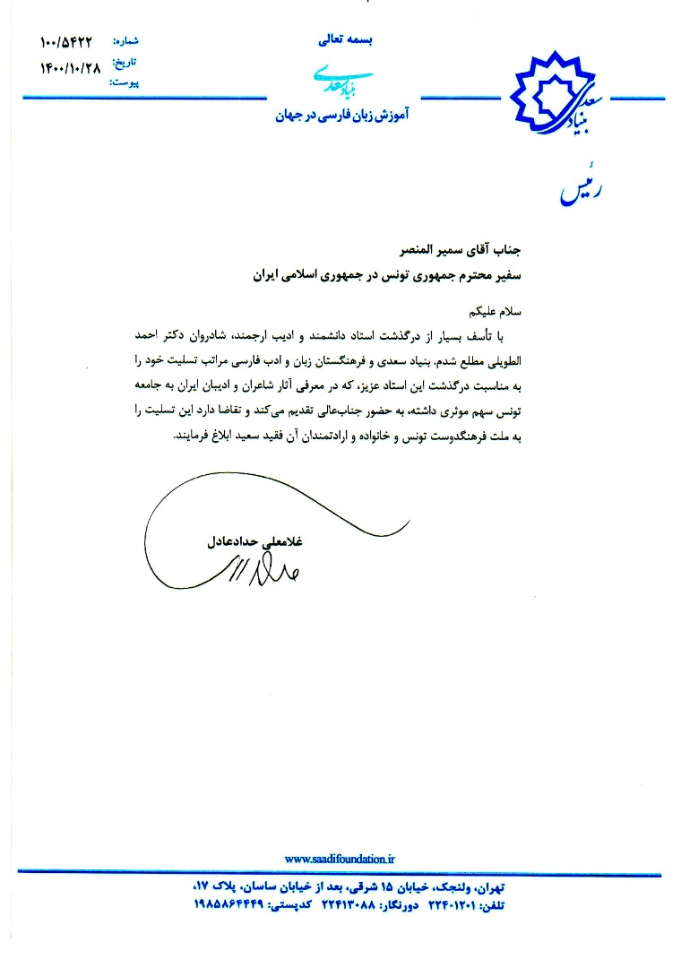 با تأسف بسیار از درگذشت استاد دانشمند و ادیب ارجمند، شادروان دکتر احمد الطویلی مطلع شدم، بنیاد سعدی و فرهنگستان زبان و ادب فارسی مراتب تسلیت خود را به مناسبت درگذشت این استاد عزیز، که در معرفی آثار شاعران و ادبیان ایران به جامعه تونس سهم موثری داشته، به حضور جنابعالی تقدیم میکند و تقاضا دارد این تسلیت را به ملت فرهنگدوست تونس و خانواده و ارادتمندان آن فقید سعید ابلاغ فرمایند.