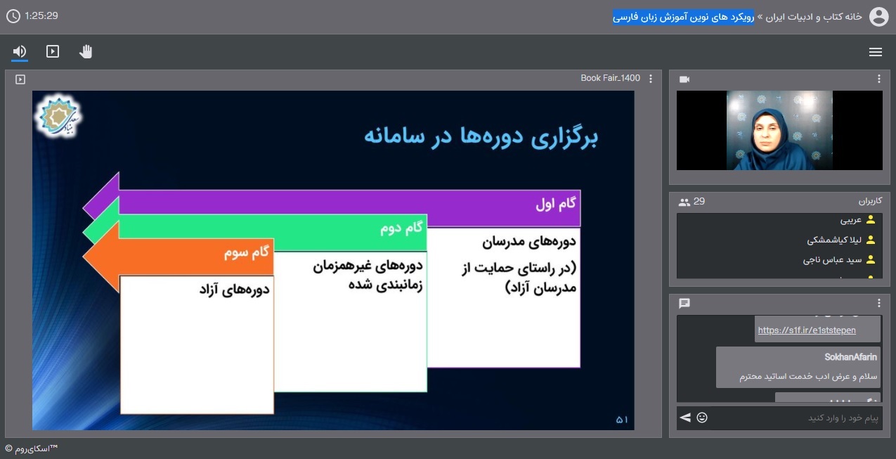 به گزارش روابط عمومی بنیاد سعدی، نشست تخصصی مجازی (معرفی سامانههای آموزش برخط «مینا» و «چارچوب») با حضور افسانه غریبی (مؤلف مجموعه کتابهای آموزشی مینا)، شهناز احمدی قادر (مؤلف مجموعه کتابهای آموزشی چارچوب) و احسان طوفانینژاد مدیر آموزش مجازی بنیاد سعدی و دبیر این نشست در دومین نمایشگاه مجازی کتاب تهران برگزار شد.