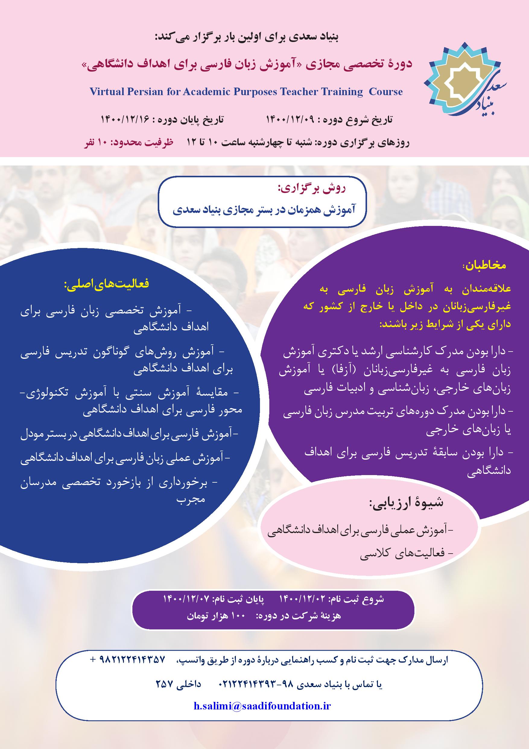 بنیاد سعدی دوره تخصصی مجازی «آموزش زبان فارسی برای اهداف دانشگاهی» را به صورت آموزش همزمان در بستر مجازی برگزار میکند.